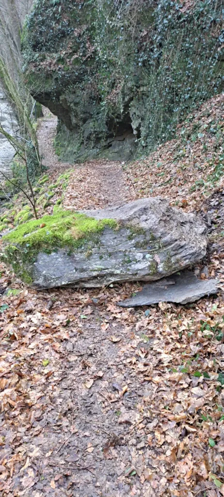 Forellenweg gesperrt! Dieser 2 m × 1,5 m große Felsbrocken ist aus einer Höhe von ca. 20m auf den Forellenweg gestürzt. Nachfolgend kommt es an dieser und an mehreren anderen Stellen entlang des Baybachs immer wieder zu Gesteinsabgängen.
